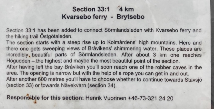 En: The route I’m taking today partially overlaps with the Sörmlandsleden, the longest hiking trail in Sweden at around 1000 km. What particularly intrigued me is that the trail is maintained by 180 members of an association with the same name. The 4 km section near the ferry crossing is maintained by Mr. Henrik, whose phone number is listed on the informational board. Wow.