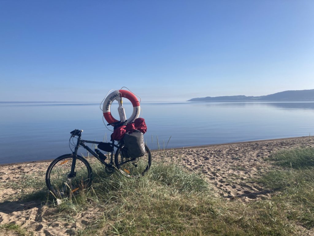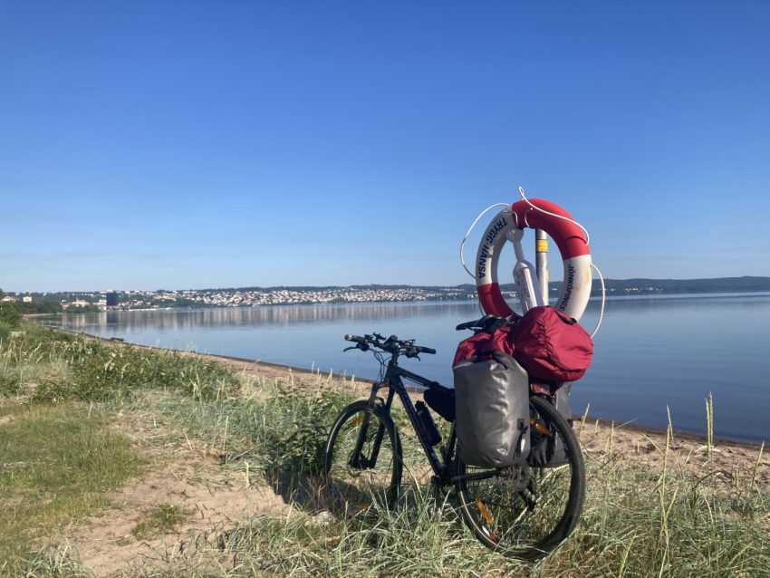 En: I leave Jönköping, riding along the beach by Lake Vättern.
