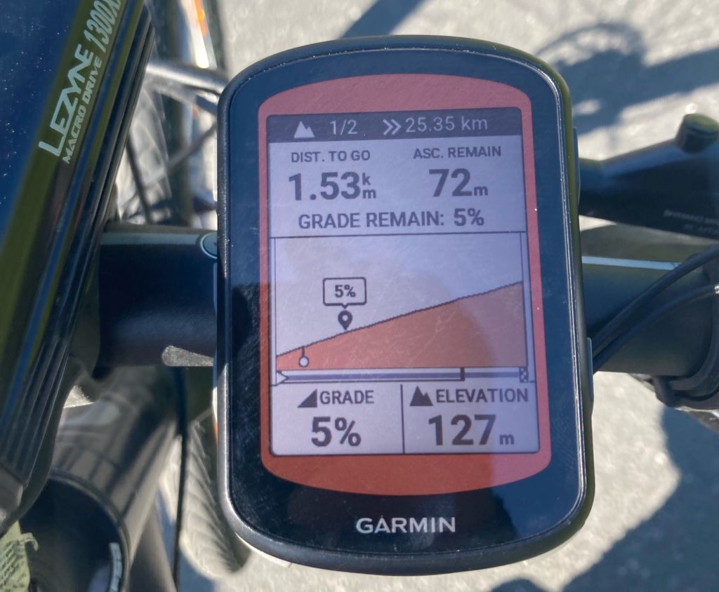 En: Today’s segment is supposed to be less hilly than yesterday, which doesn’t mean it’s entirely flat. Garmin has a neat feature that warns about upcoming climbs, and once the climb starts, it shows how much is left to the top. The first climb starts right as I leave the city. It’s quite significant, with a 90-meter ascent at a 5% gradient.