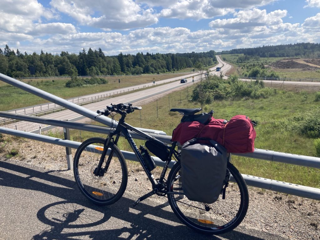 En: I arrive at a gas station with a mini restaurant, where I manage to have pancakes with jam and juice. I also restock supplies at the station’s store. As I leave, I apparently miss the correct road, as I’m now on a three-lane highway with a speed limit of 100 km/h. I look at my navigation and see: recalculating route. So, there was another way, but I must have missed it. Garmin tells me to go straight. I don’t have much choice since I’ve already gone a bit, and riding against traffic with cars speeding at 100 km/h is not something I want to experiment with right now. I ride this way for about 15 km. Even though Swedish drivers are quite cautious and maintain a safe distance from cyclists, this kind of ride requires full concentration and is quite exhausting.