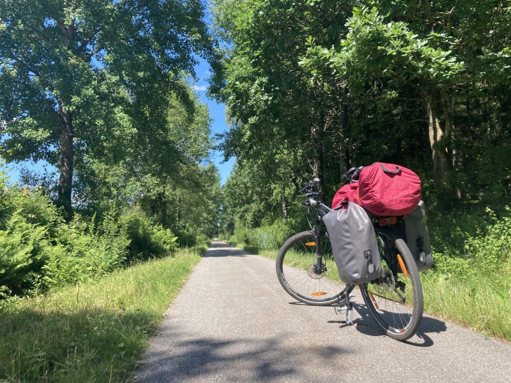 En: The gravel section through the forest was quite long. There was plenty of time for various thoughts. I glanced at my old Sigma bike computer just as the odometer hit 400 km since leaving home. I realized that I’ve never been this far from home by bike before, without flying or taking a ferry. It reminded me of a scene from “Oh, How Beautiful Panama Is!” by Janosch, where Bear and Tiger, during their journey to find the land of their dreams—Panama—meet Hare and Hedgehog, who have worked in the fields their whole lives and have never been anywhere else. They invite them over, and after hearing how wonderful Panama is, Hare and Hedgehog decide that from now on, Panama will be the land of their dreams too. Then they all go to sleep and dream of Panama.