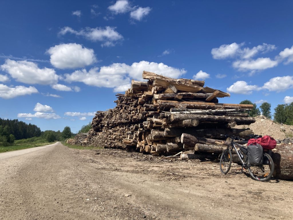 W wielu miejscach lasu, prze który jadę, pozyskiwane jest drewno. Wycinki zwykle odbywają się przy użyciu ciężkiego sprzętu, tak że po takim wyciętym lesie wiele nie zostaje. Dość przy ścieżce widać ścięte drewno.