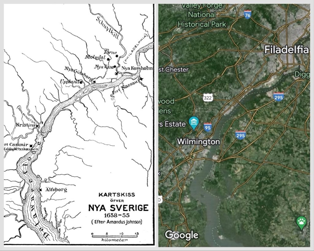 En: I found a very interesting map depicting Swedish colonies in America. Out of curiosity, I compared it with a screenshot from Google Maps.