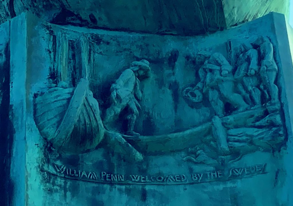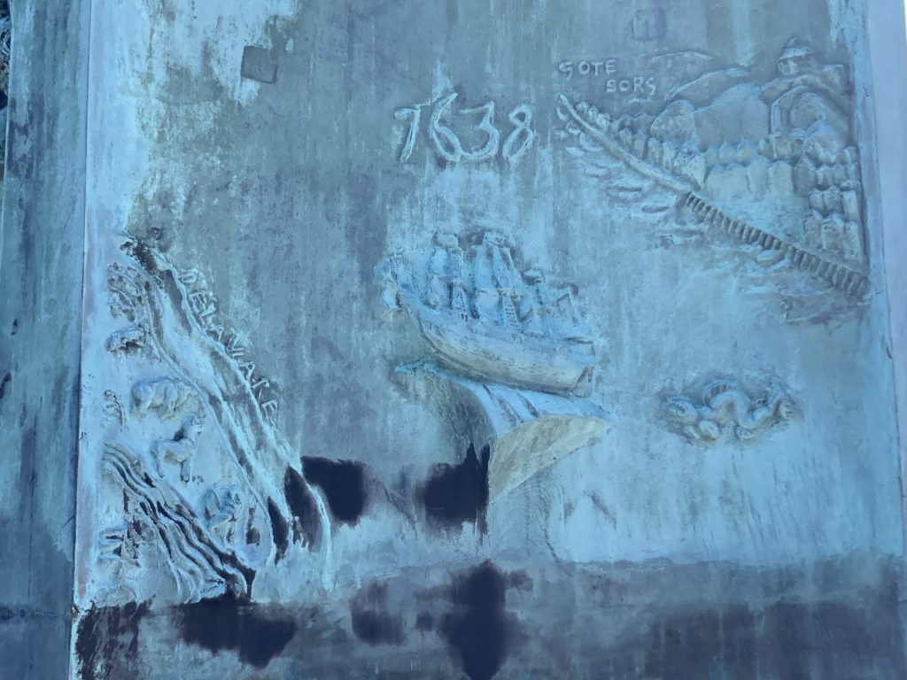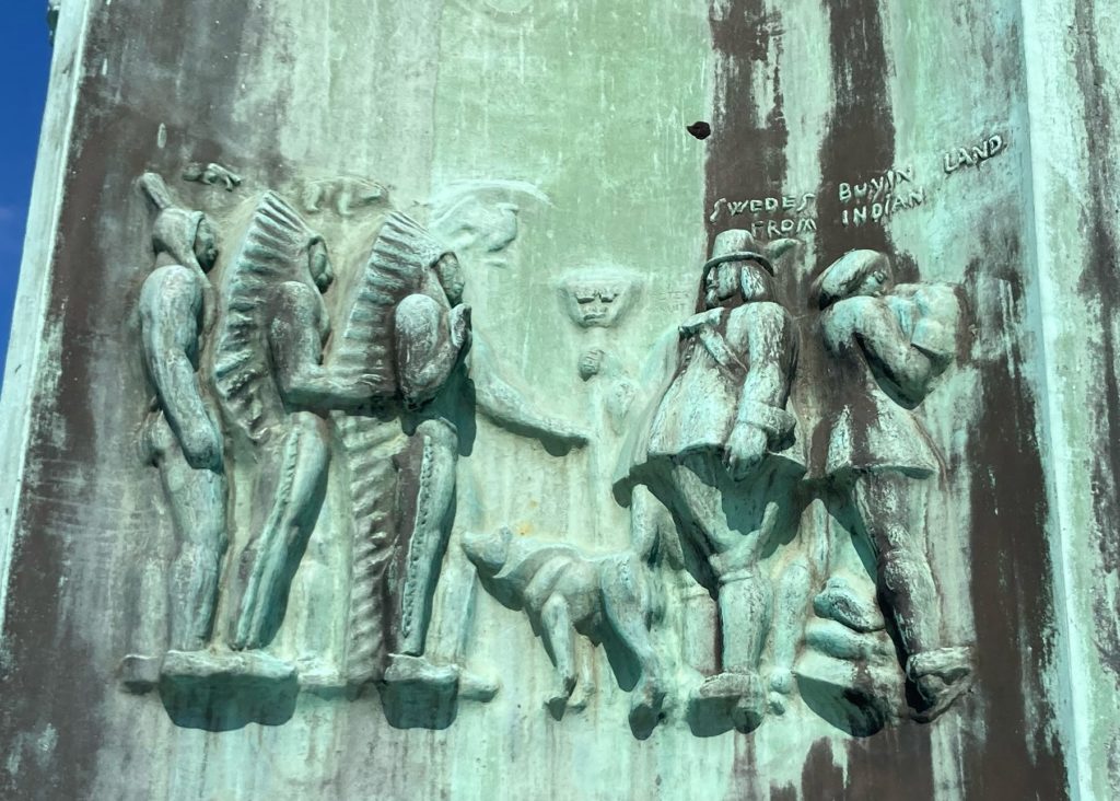 Czekając na autobus przyjrzałem się z bliska monumentowi z brązu z powyższego zdjęcia. Jest to kopia pomnika (są dwie, druga znajduje się w Sztokholmie), wykonanego w USA ze szwedzkiego granitu, jako upamiętnienie założenia pierwszej szwedzkiej osady w Ameryce Północnej w 1638 roku. Pomnik przestawia też kilka historyjek obrazkowych.