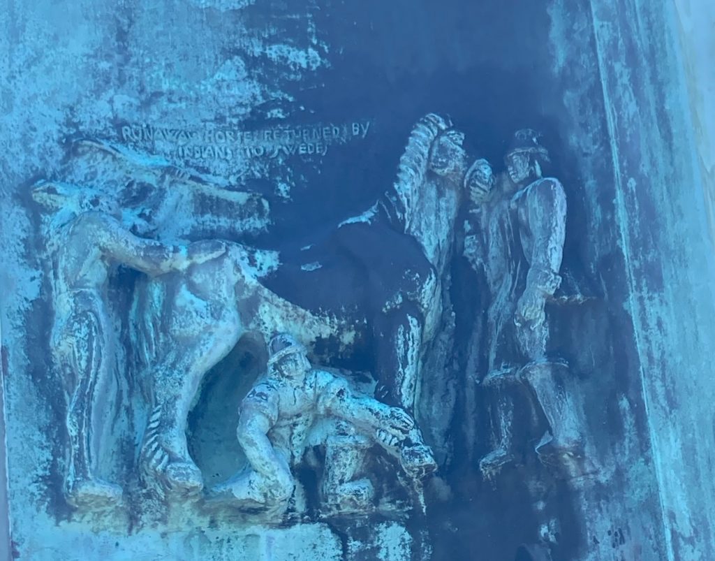 En: While waiting for the bus, I took a closer look at the bronze monument from the previous photo. It’s a replica (there are two, the other one is in Stockholm), made in the USA from Swedish granite, to commemorate the founding of the first Swedish settlement in North America in 1638. The monument also depicts several pictorial stories.