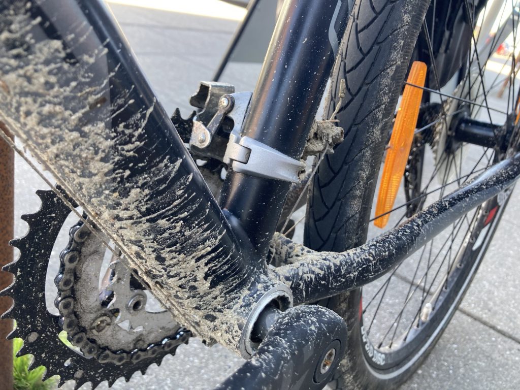 En: A few kilometers past Skagen, the sky clouded over, and it started to rain. Riding in the rain isn’t that bad as long as it’s not cold, and today it wasn’t. However, the route went through forests for a long stretch, so Kolubryna would appreciate a wash after today’s ride. But she’ll have to wait, as more rain is forecast for tomorrow.