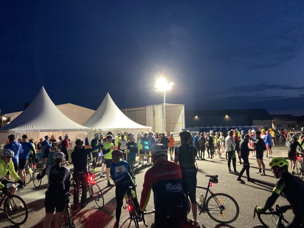 En: The race started right on schedule at 8:28 PM. We rolled out of town behind a lead motorcycle for the first few minutes, and then the group was left on its own on the open road. Well – “on its own” isn’t quite accurate, because the roadside was lined with cheering spectators for a long stretch. People were clapping, shouting encouragement, singing, and reaching out to high-five passing cyclists. It was incredibly uplifting and brought a huge smile to my face.
