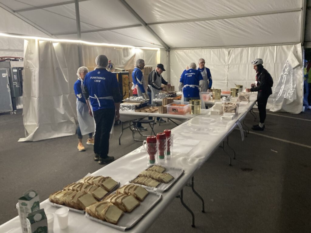 En: At the 171-kilometer mark, I pulled into the depot in the town of Hjo. I hadn’t realized how cold it had gotten it was 8°C at that point, as I later checked and I also didn’t know that the depot was located right by the lake. At 3 a.m., the humidity there was extremely high, which made the low temperatures feel even more punishing. Stopping meant my body lost its internal heat source, and in just a cycling mid-layer, I began to cool down rapidly. Lasagna and coffee didn’t help. My body started shivering uncontrollably. I couldn’t stop it, and soon I couldn’t even hold the cup in my hands. In that state, I was in no condition to continue riding. I walked over to the medical tent. By then, I was shaking so hard that the staff immediately wrapped me in two blankets and went to get me something hot to drink. I was handed a cup of warm tea with sugar and sat wrapped in blankets. Slowly, the shivering began to subside. The medics came and went, and we chatted a bit. When they found out I was from Poland, someone started a conversation about Polish vodka asking whether Żubrówka or Wyborowa was better. As someone who’s never been fond of strong liquor, I was, of course, the perfect person to weigh in on that debate 🙂 Regardless, I got exactly the kind of help I needed. Once I was warmed up as much as possible (considering how poorly dressed I was for the conditions), I got back on the bike, hoping that movement would warm me up enough to continue. And thankfully it did.