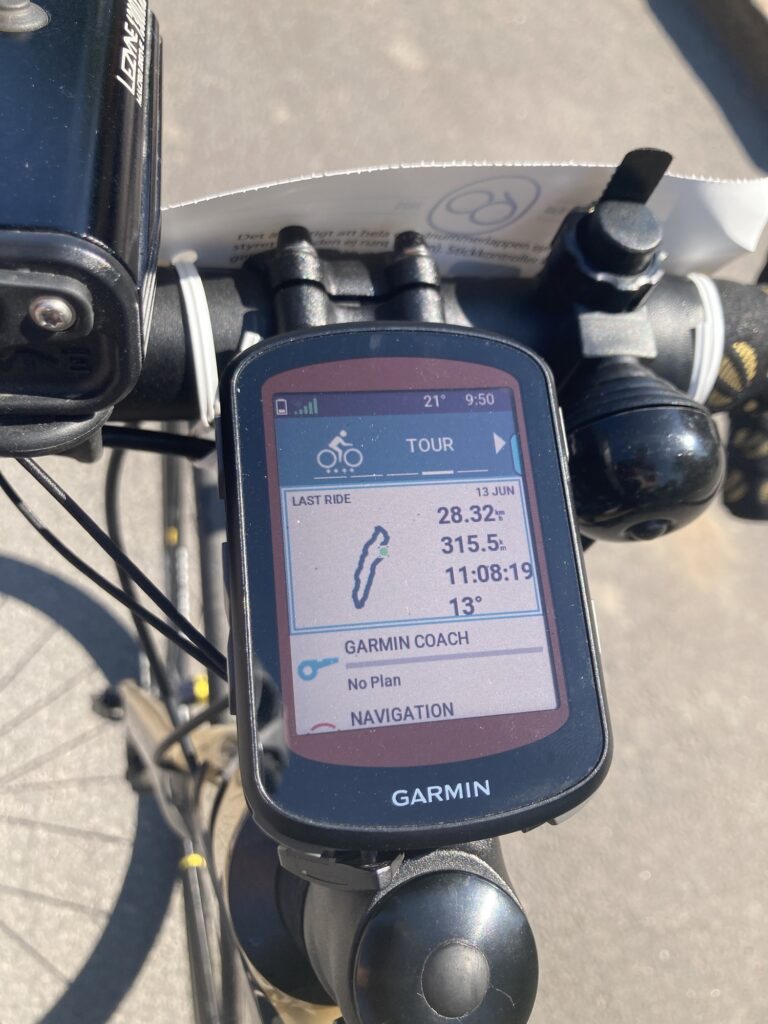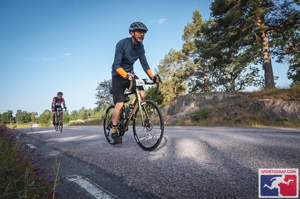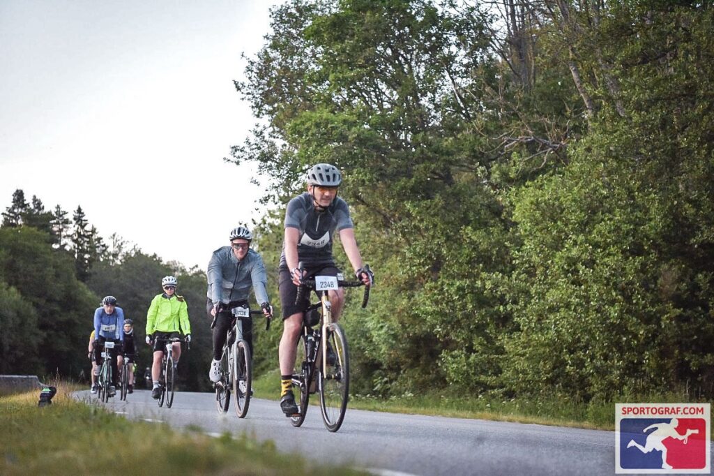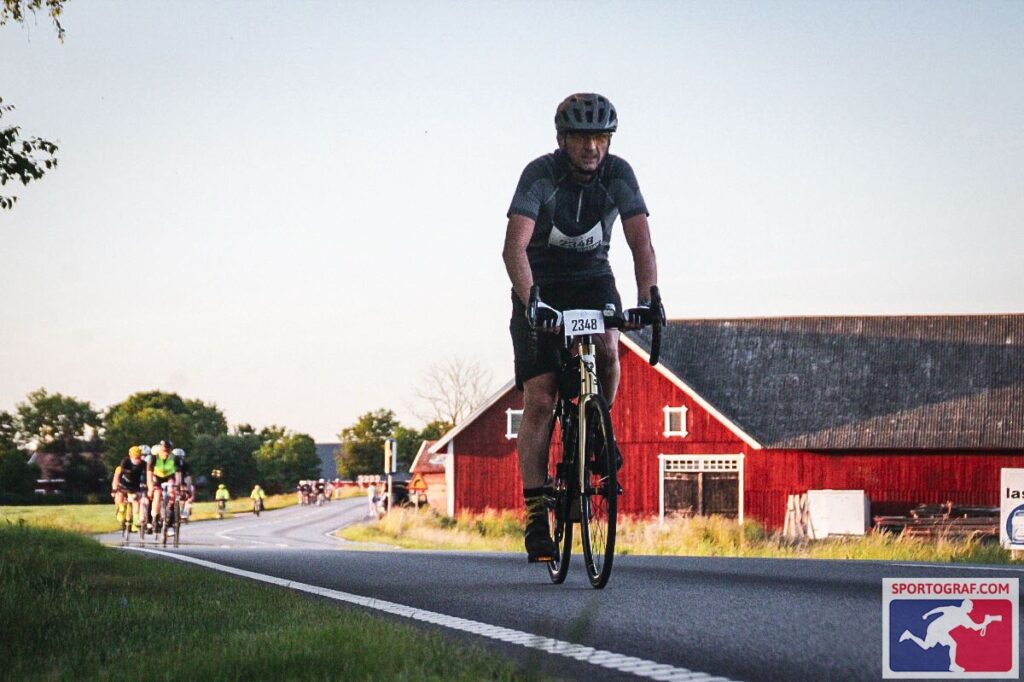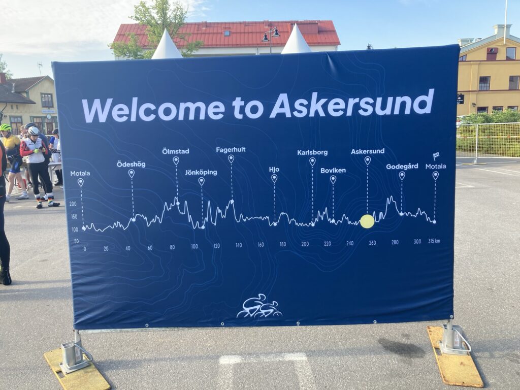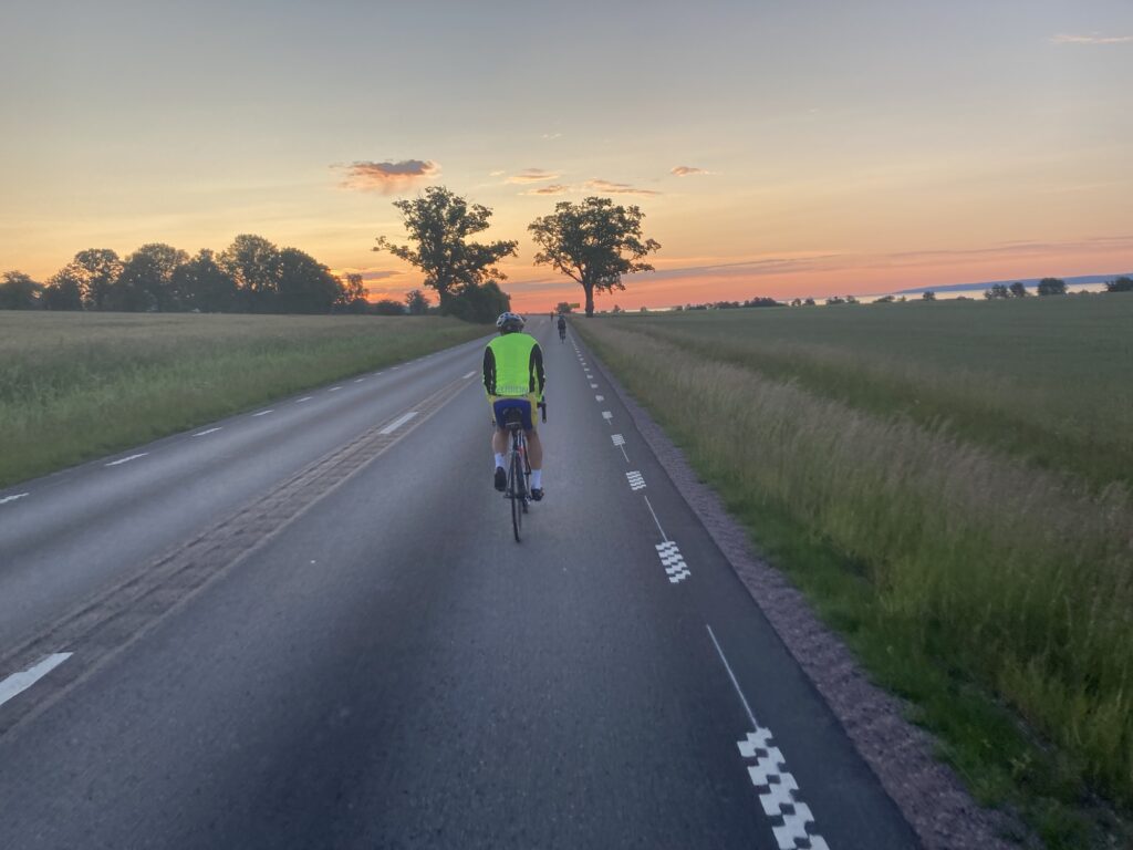 En: The sun set around 10 PM, but it stayed light for a while after that. The temperature didn’t drop enough to warrant putting on my mid-layer—in fact, in Jönköping, which is a fairly large city, it was actually a few degrees warmer. Just past Jönköping, the race’s elevation profile marked the first serious climb. I was a bit nervous about it, but on the other hand—I remembered that place. I had been there the year before, after all, riding out of the city. And the only thing I truly remembered about that climb was my Garmin warning me it was coming 🙂