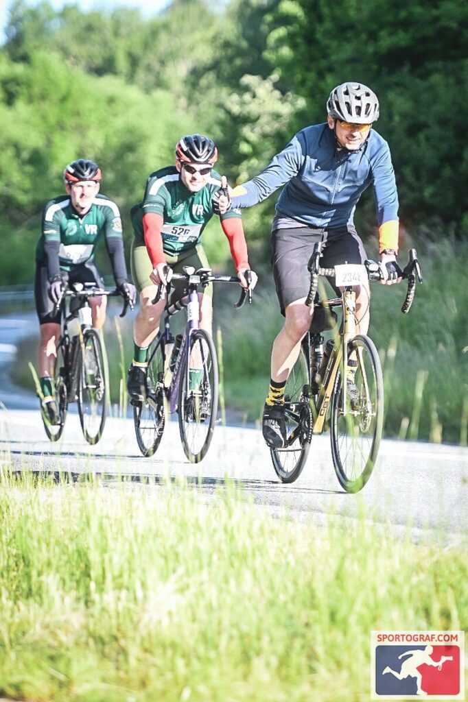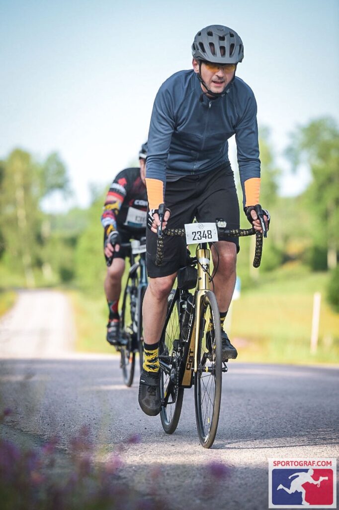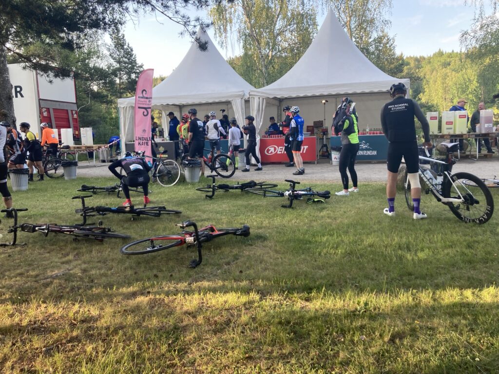 Ruszyłem z dość wolną grupą, która przy każdym podjeździe zmniejszała prędkość do kilkunastu kilometrów na godzinę. Doceniłem elektryczne przerzutki w moim rowerze. Przy takim poziomie zmęczenia i odrętwienia dłoni siłowanie się z manetkami zmiany biegu byłoby uciążliwe. Tu wystarczyło lekkie wciśnięcie przycisku i od razu odzywał się miły dla ucha dźwięk zmiany położenia zębatki prowadzącej. Po jakimś czasie miałem dość wolniejszej jazdy, więc przyspieszyłem żeby wejść na nieco wyższe tempo. Po 20 kilometrach znów mnie dopadło, więc zjechałem na kolejny depot w Godegård.