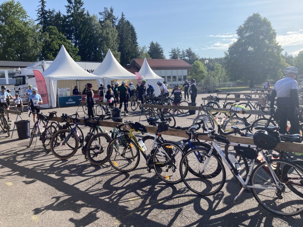 En: Along the route, the organizers had set up 10 depots – stations with food, water, medical staff, and bike repair services. I skipped the first one at the 47-kilometer mark because I wasn’t tired yet and was riding comfortably with my group. I thought I’d skip the next one too, but fatigue was starting to creep in, and my group had pretty much fallen apart. So I pulled into the depot at the 83-kilometer mark in the town of Ölmstad. I figured it was time to try one of the energy gels I had brought with me. Fortunately, the sachet was small, because the gel tasted awful and made me feel nauseous. I quickly decided that the sweet buns and coffee being served at the stop were a much better option. From that point on, they became my go-to fuel at every depot.