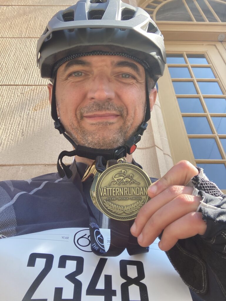 En: The first few kilometers felt pretty normal – just the usual warm-up after a stop. But then, suddenly, I got a surge of energy. No matter the incline, my legs were charging forward like pistons. And now I honestly don’t know if it was the chips and pickles, the fact that it was the final stretch, or simply that I was finally able to take off my cycling layer and feel the warmth of the sun on my frozen skin again. Whatever it was, I felt amazing. No more energy crashes, no more crises. I passed dozens of cyclists along the way, rolled into Motala to the cheers of fans, and just past the finish line, I was handed a finisher’s medal, a vegan burger, and a can of non-alcoholic Carlsberg. I couldn’t have imagined a better way to end this journey.
