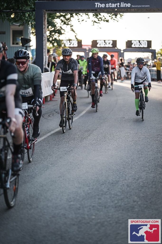 Wyścig zaczyna się o 19:30, kolarzy jest dużo (Fredrik mówił, że w tym roku około 20 tysięcy), więc są podzieleni na grupy. Grupy startują w dwuminutowych odstępach, moja grupa startowała o 20:28. Tak że czekała mnie jazda nocna. Wyposażyłem rower w dodatkowy reflektor, którego używam jak jeżdżę nocą Kolubryną po lasach. Prognoza pogody mówiła, że temperatura w nocy nie spadnie poniżej 11 stopni, więc ograniczyłem dodatkowe ubrania wyłącznie do bluzy rowerowej (tzw. middle layer). Zabrałem też kilka batonów z orzechami i czekoladą i parę izotonicznych napojów energetycznych. Z tymi ostatnimi nie miałem żadnego doświadczenia, ale naczytałem się że to podstawa w takich wyścigach, a w bike expo sprzedawali je na każdym kroku. Były wręcz stacje uzupełniania tych specyfików. Tak że na próbę kupiłem kilka saszetek.