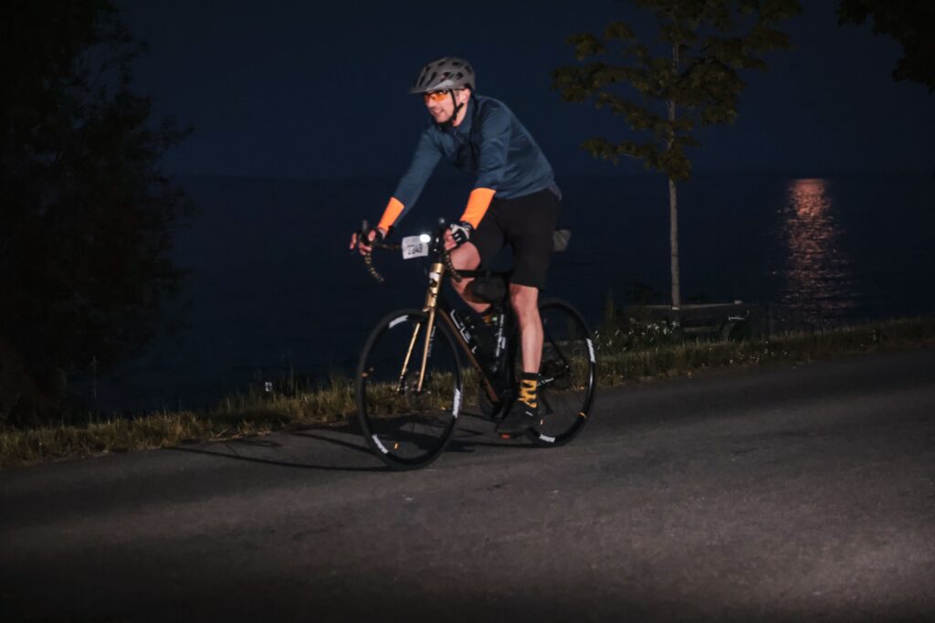 En: As night settled in, the temperature began to drop – not suddenly, but gradually over time. I was riding comfortably with a group, so I skipped the 133-kilometer stop. However, that group eventually broke apart, and on this side of the lake, there were noticeably fewer cyclists. Groups were rarer, and I saw a lot of solo riders. There were moments when I found myself eagerly scanning the darkness for the red tail lights of other bikes, just to have someone to ride with and avoid being completely alone. In those moments, I was especially grateful for bringing my headlamp, which faithfully lit up the road ahead. Sure, you could make out the road in the twilight, but having a clear, illuminated path in front of you makes a huge difference in how safe you feel. A few times, that headlamp even saved me from riding straight into potholes I would have never spotted without it.